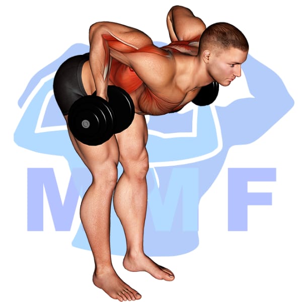 Man performing barbell bent over rows with MuscleMagFitness logo background.