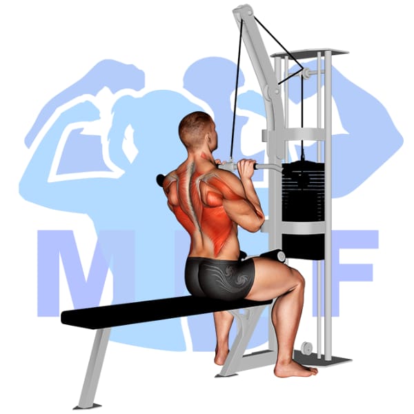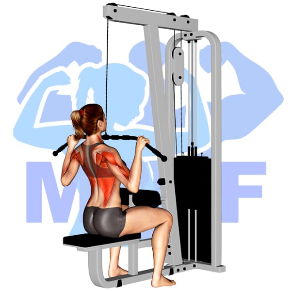 Man performing lat pulldowns with MuscleMagFitness logo background.